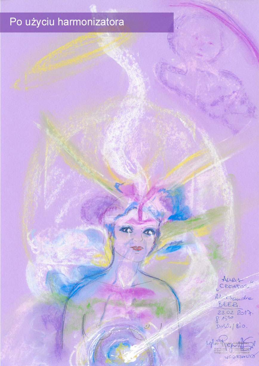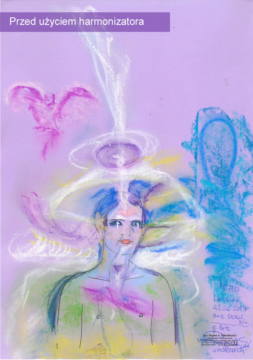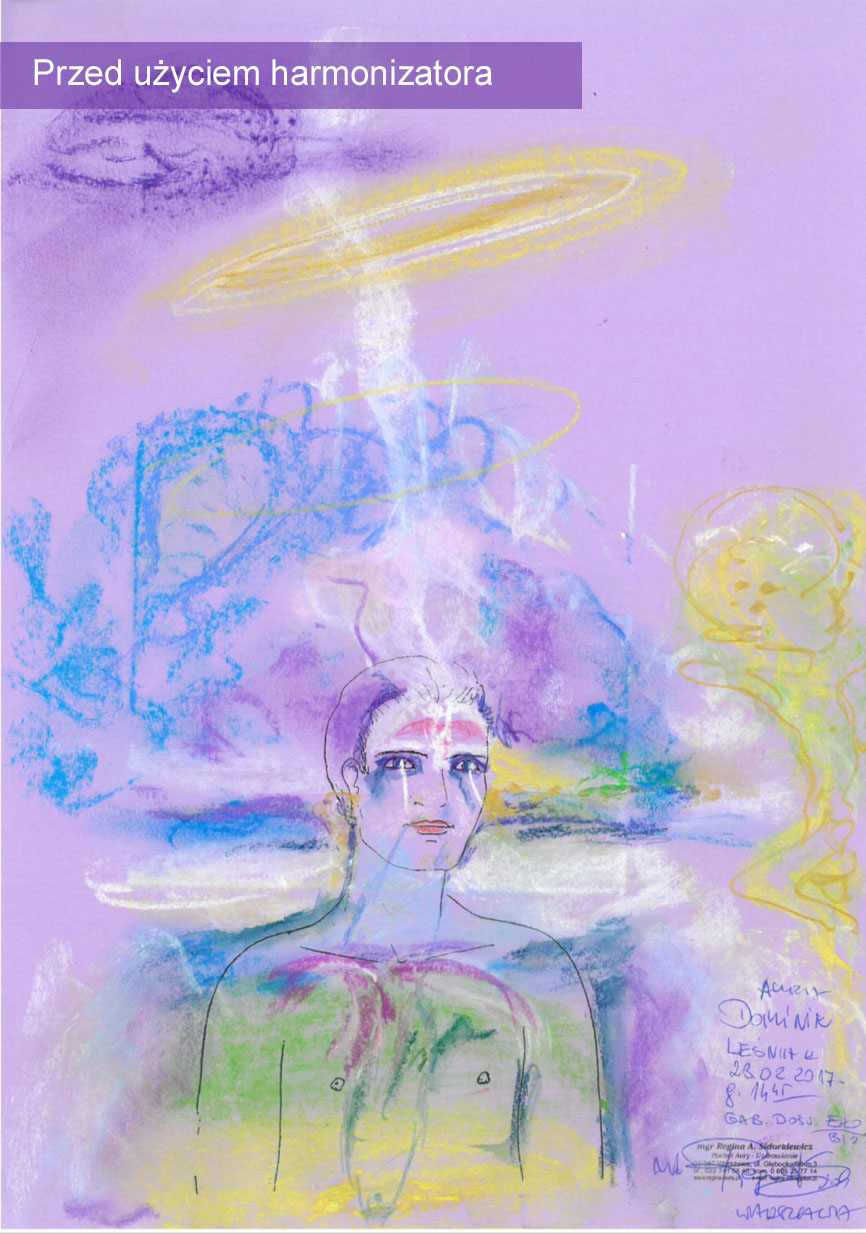 Aura po użyciu harmonizatora jest stabilna, nie ma zakłóceń (niebieskich form). Aura jest bardziej ułożona, bardziej spokojna, zrównoważona, patrząc tylko na sam przekaz graficzny, to ukazana jest harmonia, pewna obecność, wpływ duchowy. Widoczna jest bardzo dobrze obecność wyższej natury i opieki duchowej (postać u góry). Przekrzywienie strumienia nad głową w lewą stronę jest związane z przesunięciem i odsunięciem tzw. wpływów karmy i wpływów pokoleniowych. Harmonizator bardzo silnie działa i otwiera przestrzeń u góry, umożliwiając działanie mocy, która kształtuje tego człowieka.