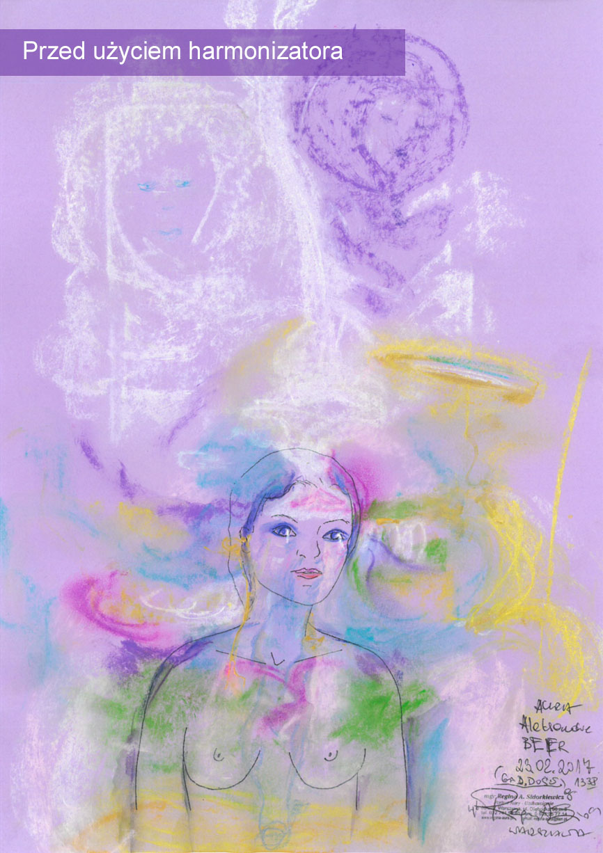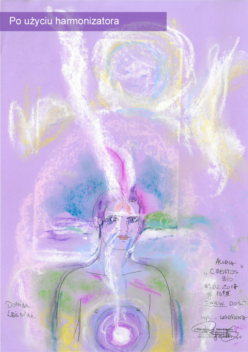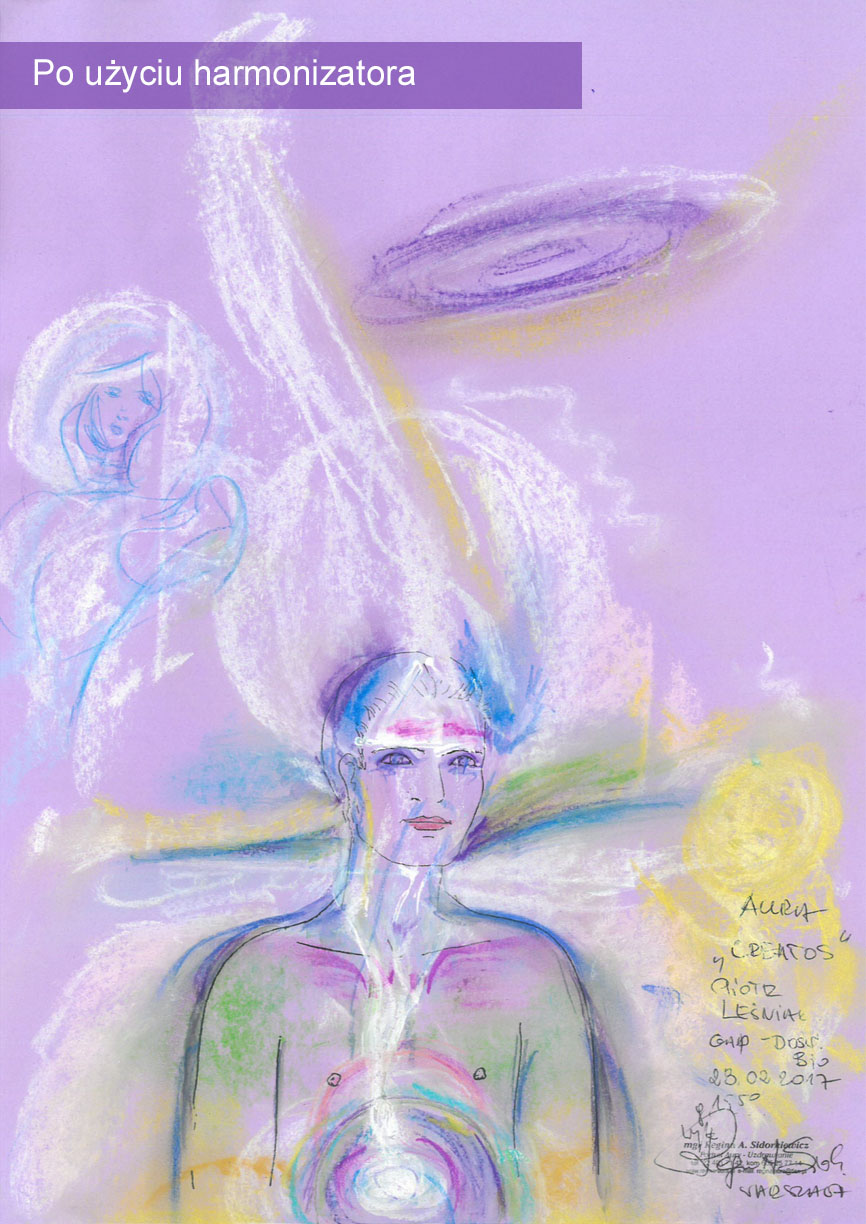 Aura po użyciu harmonizatora jest stabilna, nie ma zakłóceń (niebieskich form). Aura jest bardziej ułożona, bardziej spokojna, zrównoważona, patrząc tylko na sam przekaz graficzny, to ukazana jest harmonia, pewna obecność, wpływ duchowy. Widoczna jest bardzo dobrze obecność wyższej natury i opieki duchowej (postać u góry). Przekrzywienie strumienia nad głową w lewą stronę jest związane z przesunięciem i odsunięciem tzw. wpływów karmy i wpływów pokoleniowych. Harmonizator bardzo silnie działa i otwiera przestrzeń u góry, umożliwiając działanie mocy, która kształtuje tego człowieka.